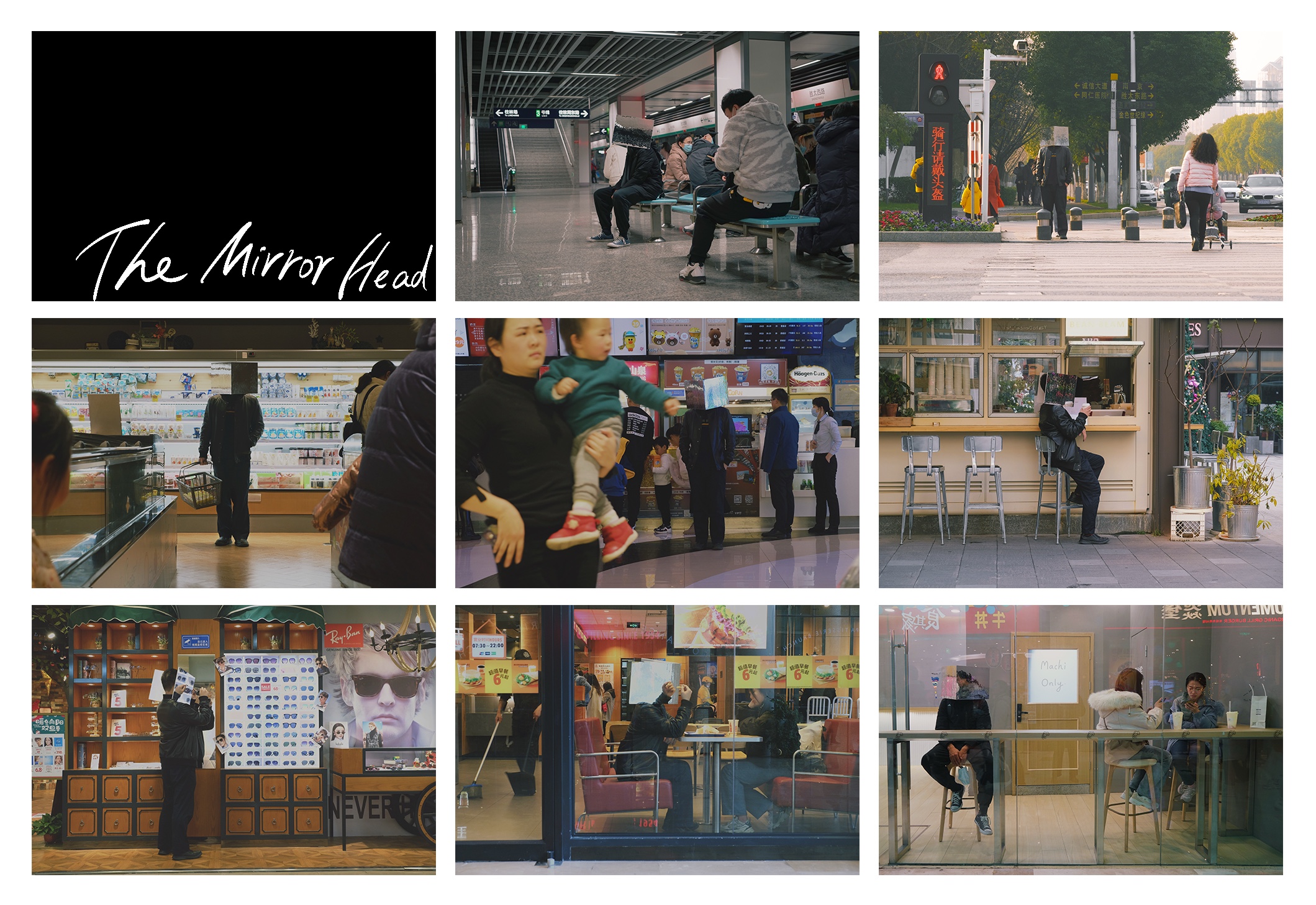 The video documentation is about a series of daily acts performed by Mirror Head in public places. The character appears without warning, standing or sitting still while reflecting the surroundings, or mimicking the actions of nearby people. Immersed in a consumerist environment, passers-by rarely pay extra attention to Mirror Head — this figure appears no different from anyone else.